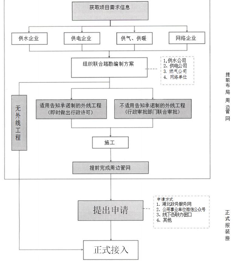 ( 一) 一 口登記早服務(wù)。 新建投資項(xiàng)目在土地出讓階段, 隨同填寫《用戶獲得水、電、氣、網(wǎng)、暖需求信息采集單》, 對(duì)新建項(xiàng)目施工和生產(chǎn)所需的用水、用電、用氣、用網(wǎng)、用暖 需求進(jìn)行意向登記。將項(xiàng)目報(bào)裝需求通過湖北政務(wù)服務(wù)網(wǎng)、工 改平臺(tái)傳遞給各公用事業(yè)單位,公用事業(yè)單位聯(lián)合上門對(duì)接, 根據(jù)用戶需求提前布局項(xiàng)目周邊區(qū)域管網(wǎng),為用戶后續(xù)獲得水、電、氣、網(wǎng)、暖接入作好準(zhǔn)備。